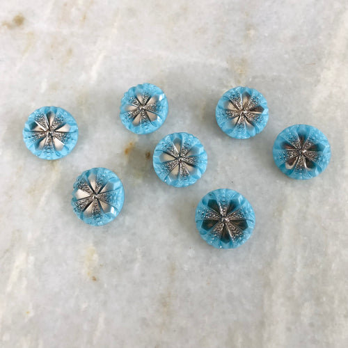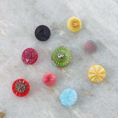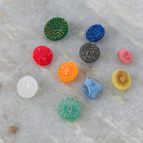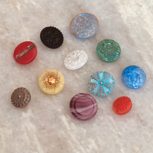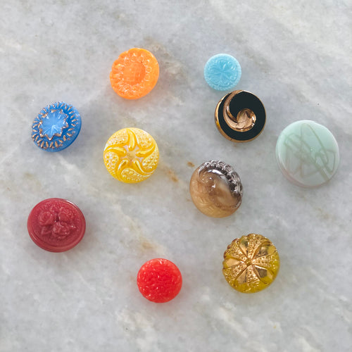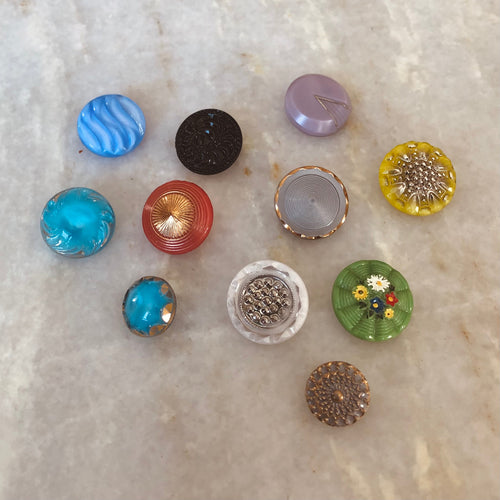 Jeg har alltid hatt en stor svakhet for vakre saker. Gamle vintageknapper kan få hjertet mitt til å hoppe over et slag. Starten på knappesamlingen min kom da jeg arvet det gamle sybordet etter farmoren min. Hun var en sånn som kunne alt og hadde alt mulig rart og nødvendig på lur. Blant annet en masse gamle knapper. Siden har jeg samlet. Jeg ser alltid etter fine knapper, og har et velutviklet gen for å samle. Knappesamlingen min har for lengst vokst langt utover min egen bruk. Men bare å se på disse skattene gir meg stor glede. Nye fargekombinasjoner dukker ofte opp i hodet mitt etter å ha "lekt" litt med knappesamlingen. Inni mellom legger jeg ut noen vintageknapper som jeg har flere av, og som jeg håper noen andre kan ha glede av.