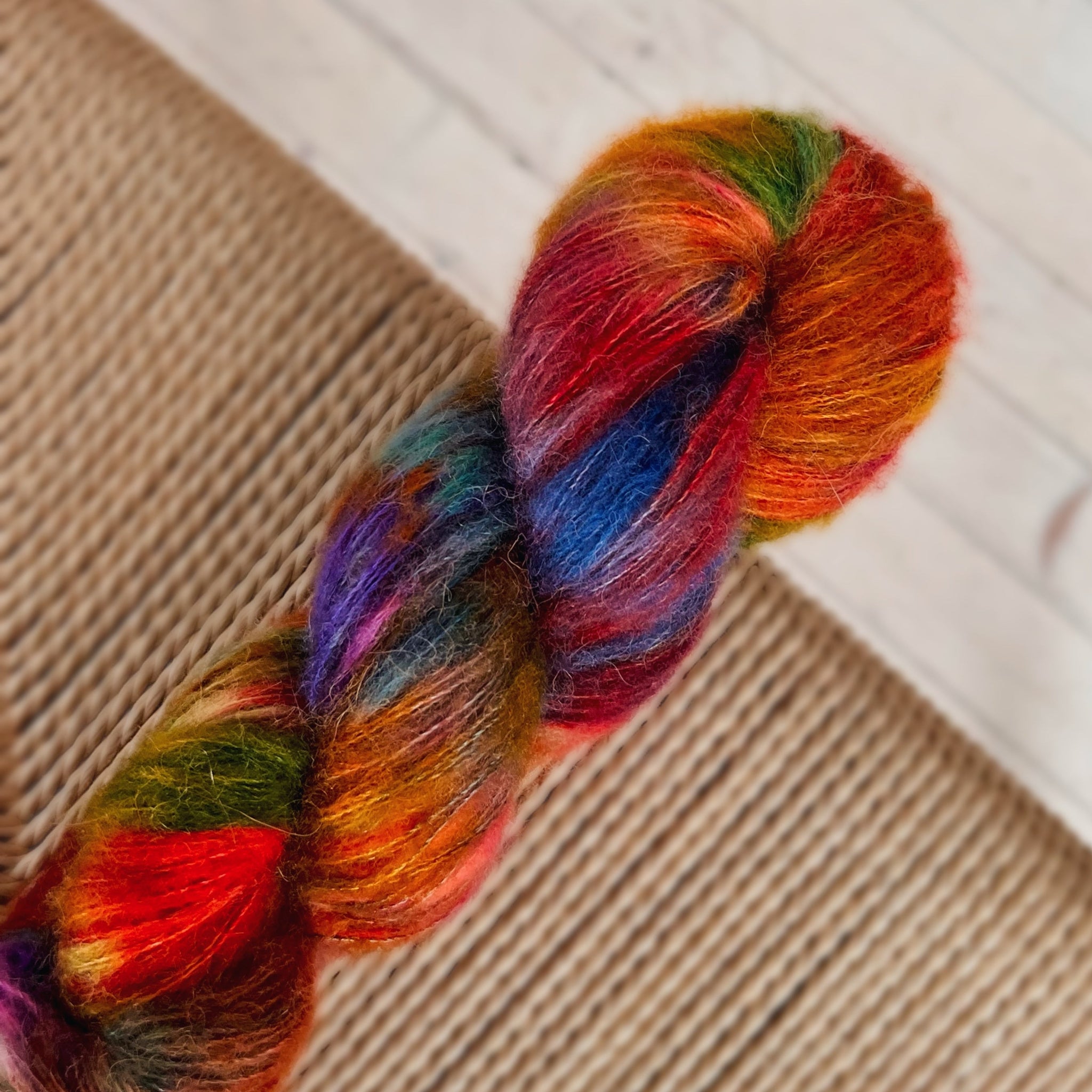 Hvert hespe er 50 gram/ca. 400 meter. Og er mykt, pusete, lett og bare superdeilig! Et nydelig alternativ til deg som ikke tåler silk mohair, men ønsker en god erstatning. Fin høy glorie, pusete, men røyter ikke og mens jeg har testet den så har jeg kunnet bruke den rett på huden.