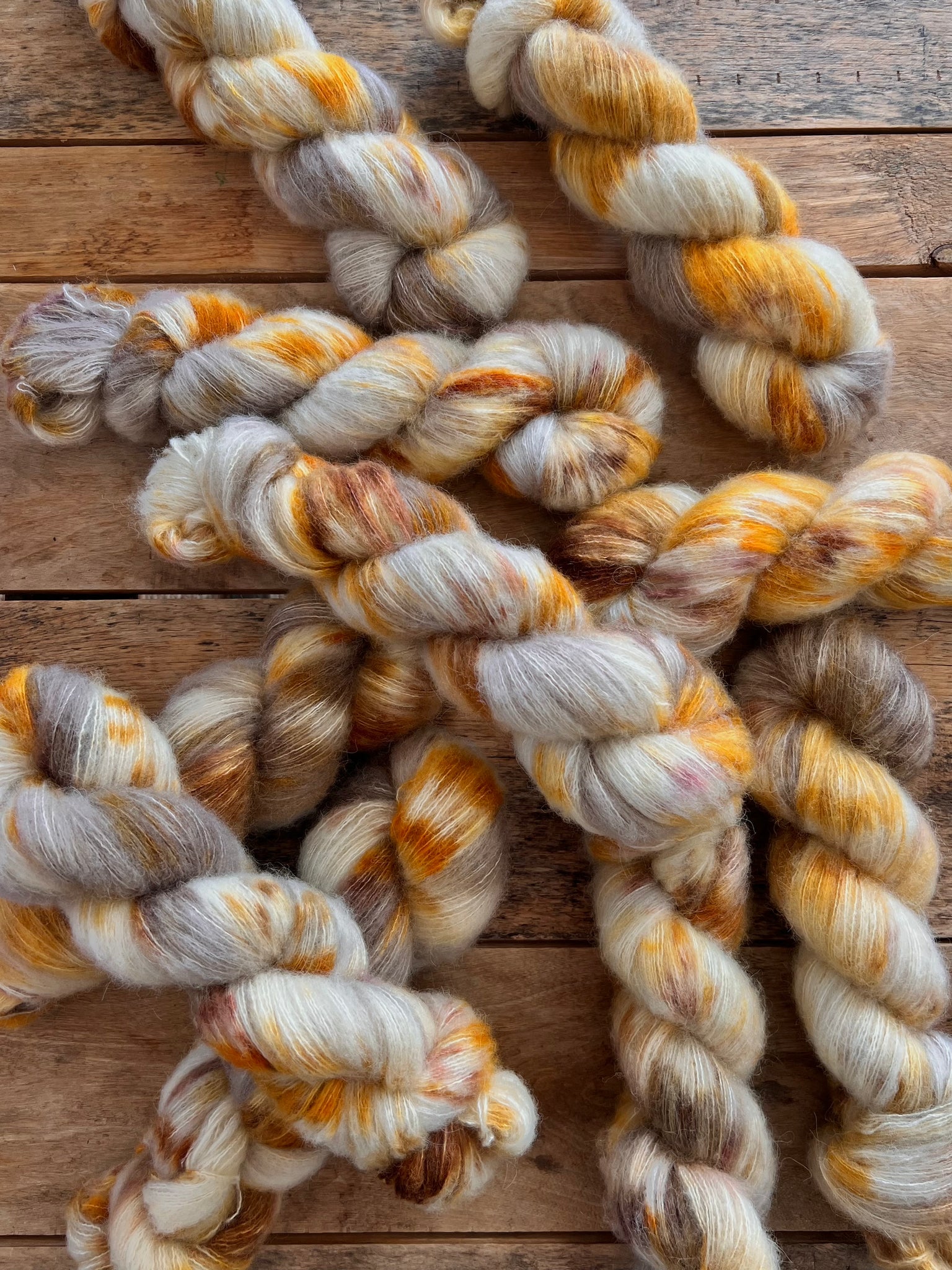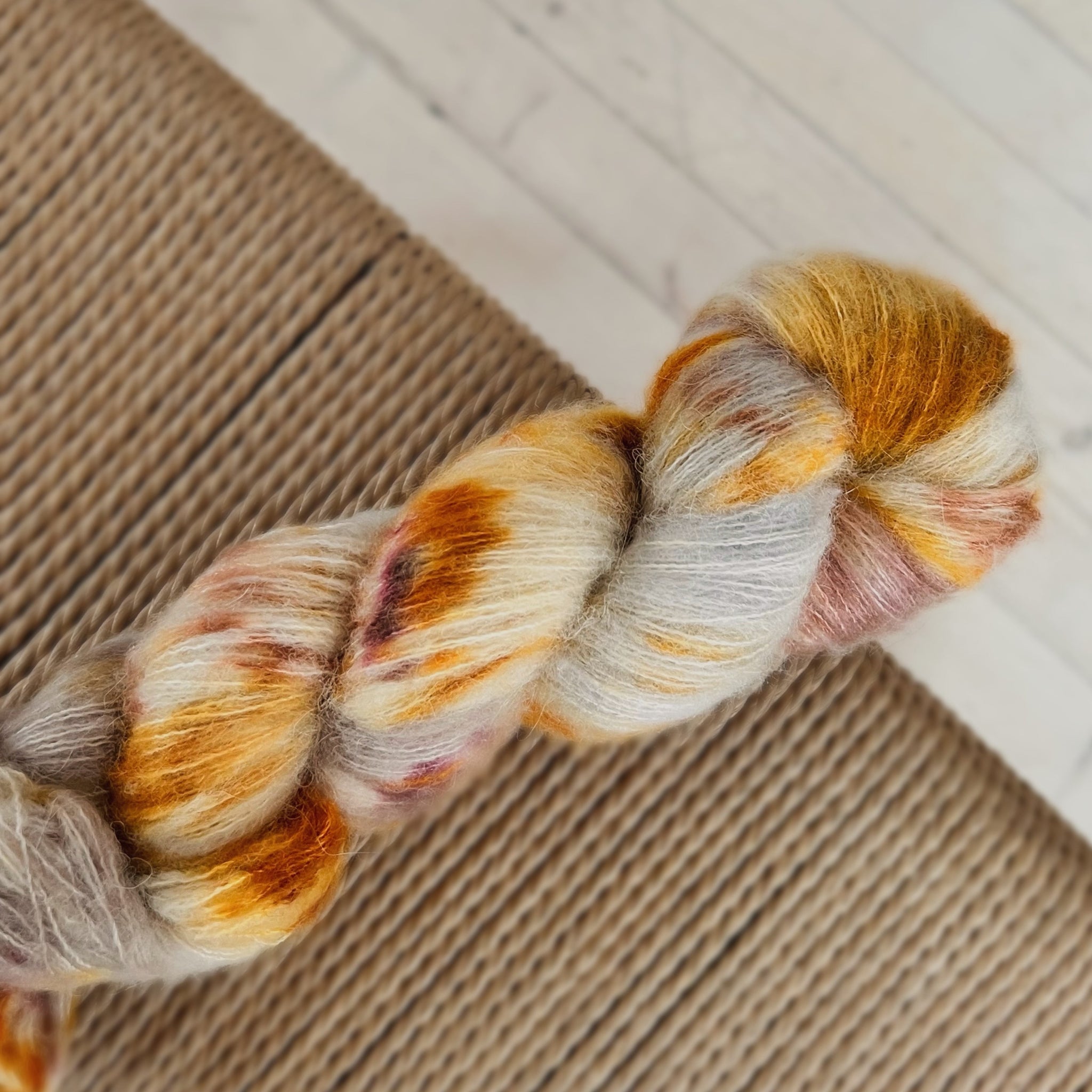 Hvert hespe er 50 gram/ca. 400 meter. Og er mykt, pusete, lett og bare superdeilig! Et nydelig alternativ til deg som ikke tåler silk mohair, men ønsker en god erstatning. Fin høy glorie, pusete, men røyter ikke og mens jeg har testet den så har jeg kunnet bruke den rett på huden.